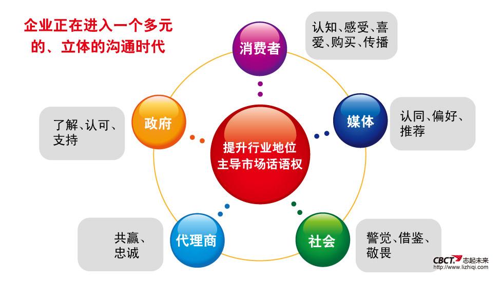 品牌3.0時(shí)代,企業(yè)正在進(jìn)入一個(gè)多元的、立體的溝通時(shí)代,企業(yè)不僅要與消費(fèi)者溝通,得到消費(fèi)者的認(rèn)知、感受、喜愛(ài)、購(gòu)買(mǎi)和傳播;還要得到政府的了解、認(rèn)可與支持;得到媒體的認(rèn)同、偏好和推薦;與代理商雙贏;對(duì)社會(huì)輿論保持警覺(jué)和敬畏,注重公共關(guān)系建設(shè)。